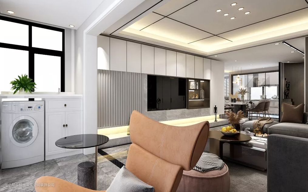 追求实用的话,还是将阳台做成功能区,在阳台一边设置到顶阳台柜,嵌入洗衣机和烘干机等,满足洗衣、晾衣的需求。而且还可以利用阳台柜的收纳做成储物区,存放一些清洁用品或不常用的生活杂物,实用的很