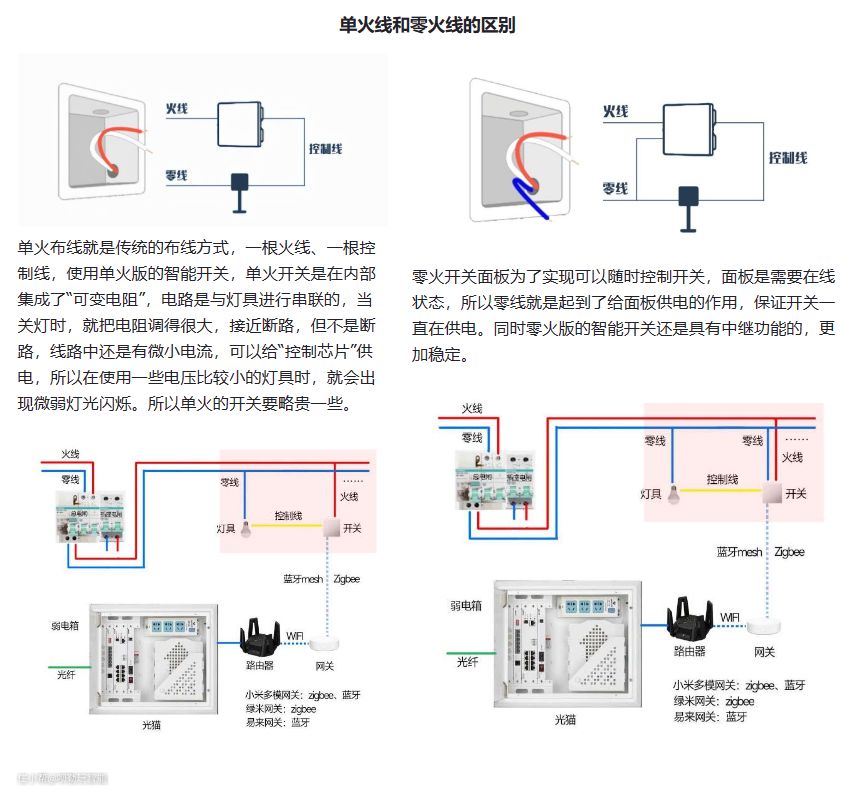 装修时建议一定要预留零线,起到长通电作用。部分品牌零火开关具有中继功能,信号会更强更稳定。后期也可以安装颜值更高的触屏类设备。零火开关相比单火开关价格更低。