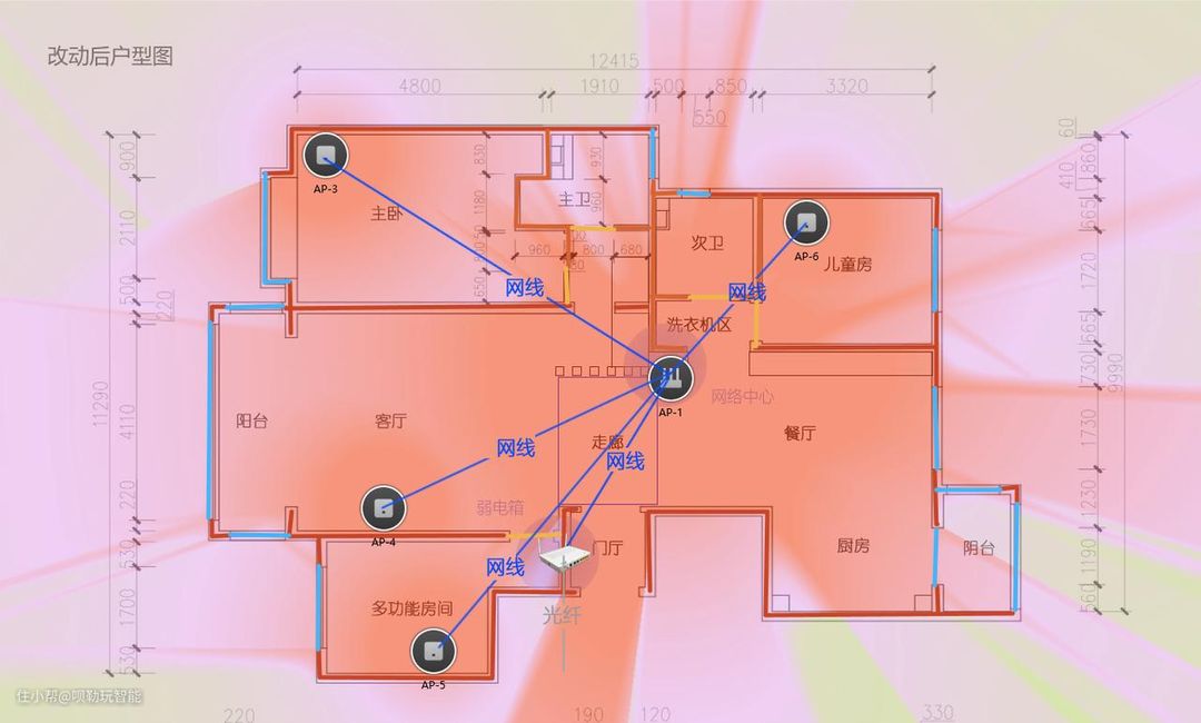 根据信号仿真图,可以使用2台以上的mesh路由器组网,也可以通过AC+AP的方式组网,来满足家里智能家居设备WIFI信号的问题