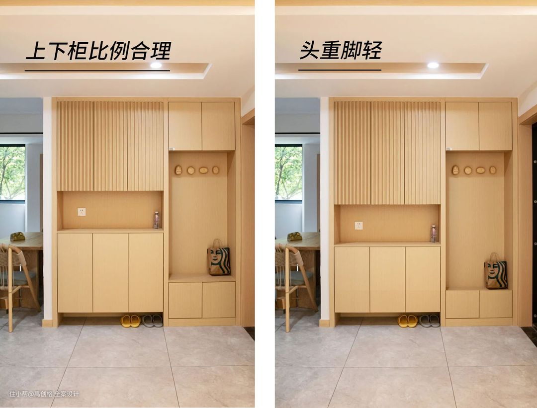其实这里需要注意的一个关键点在于比例问题:下柜在做的时候需要考虑鞋柜底部放鞋的高度除去之后在对上下柜进行合理分配,如此一来便能规避“头重脚轻”的这个问题。