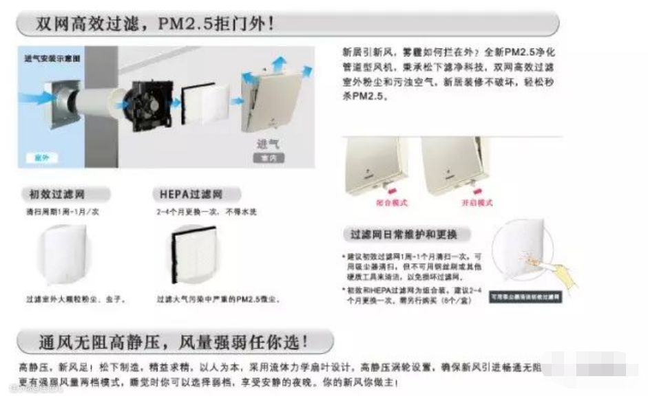 单向壁挂式新风本质上就是一个反着安装的排气扇加了一层过滤网,松下入门款700元就能买到,空气经过过滤后直接送入房间,而污浊空气则从窗户和门的缝隙里排出去。