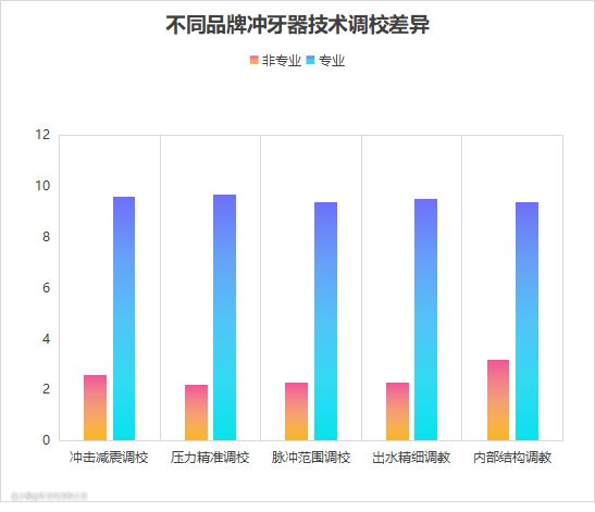 有专业技术实力的品牌会针对脉冲频率的动力长期衰减度及水压强度范围、出水克度的均衡性、出水精度优化等上百项内核参数都做了反复的调教优化,仅伤牙率一项就比不专业品牌降低300%之多,这样的产品才能适配国人复杂的口腔。