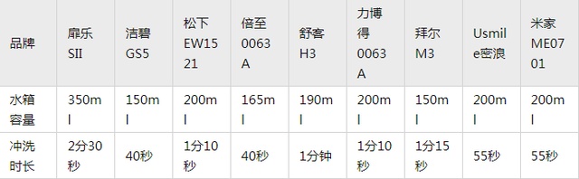 在使用冲牙器的时候,装满水的单次使用时长也非常重要,毕竟用着用着没水了,二次装水是非常麻烦的,而且还影响冲洗的节奏,忘了刚才冲洗到哪里,可能导致二次冲洗而伤牙。影响的使用时长的主要因素有水箱容量、出水速率等,下面是9款冲牙器的使用时长统计表: