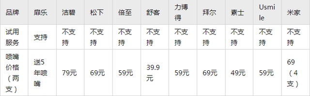 然后说一下喷嘴替换成本,各品牌的喷嘴成本在几十到几百元不等,这其中舒客、米家的喷嘴较便宜,大概20元左右一支。扉乐免费赠送5年喷嘴,无疑是最划算的。