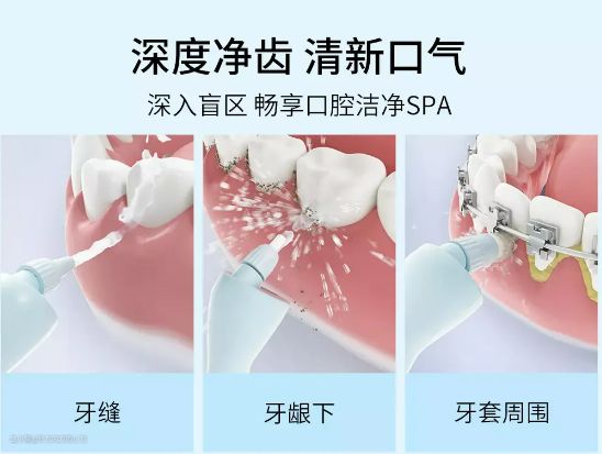 冲牙器可以弥补牙刷的清洁盲区,全口腔无死角清洁,针对牙缝、牙龈沟、牙窝沟等位置效果显著,保障口腔干净,没有牙菌斑残留,从源头避免牙病产生。