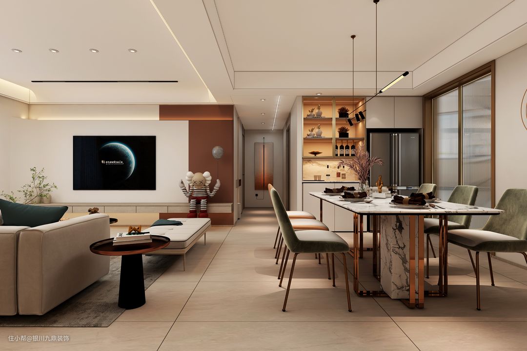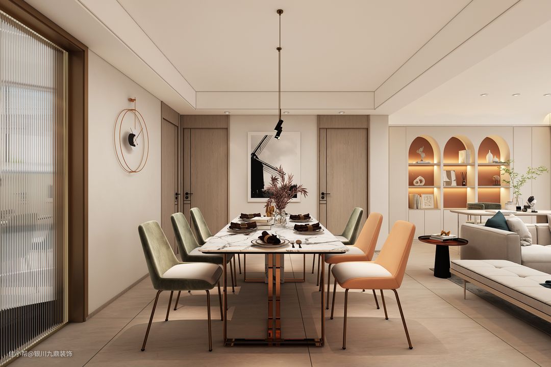 客餐的一体化设计,模糊了传统的空间界限,有了更丰富的连续感,设计从细腻的材质对比和空间尺度的收房入手,重拾了材料和人感官的联系。