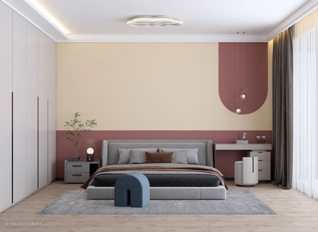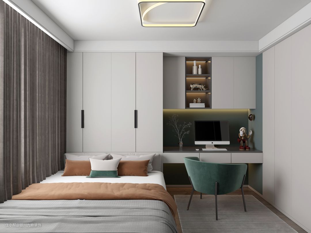 次卧在精致的设计基调下烘托出玲珑简洁的优雅,睁开眼就能感受到阳光的温暖和煦,纱帘的自由舒展,辽远的窗景映照的空间如此澄明,精致中照拂日常,浪漫和理性在这一刻完美结合。