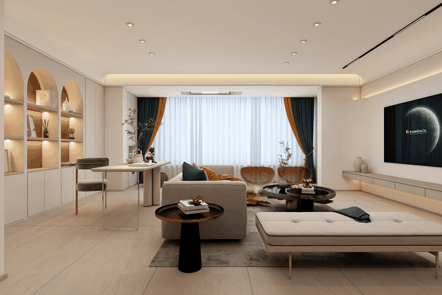 书房客厅融为一体的动线设计布局,休闲之余自然随意的翻阅历史著作和现代经典文学。弧形的书架设计,使空间充满活力。