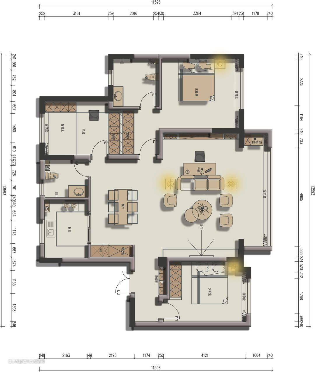 将客厅、餐厅、书房结合在一起