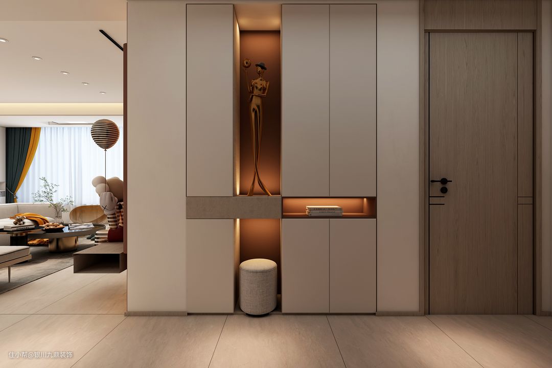 入户门口玄关是一个缓冲过渡地段。虽然是居室空间中狭小的一角,却对整个居室的风格起着至关重要的作用。玄关处的鞋帽柜精心设计,以实用为主,搭配暖色光源使空间明亮又富有想象力。