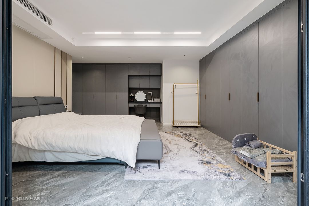 卧室面较大,纵深长,一眼看上去是非常开阔的。在卧室里设计师也是延续了公区的灰色系为主,通铺灰色大板地砖,搭配灰色系的衣柜以及家具。