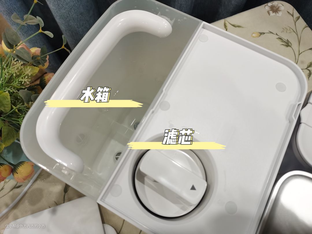 内部构成很简单,打开盖子,水箱和滤芯清晰可见。
