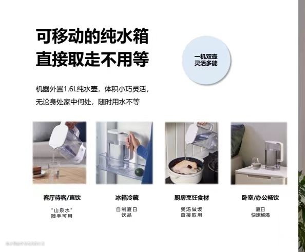 原来即热净饮机的优点就是放哪里都可以,但是毕竟是个机器来回搬还是有些不方便的,但是我又是对生活品质要求极高的人,我是做饭煲汤甚至洗菜都会用纯净水的。这时候如果有纯水拆卸的水箱,我直接取了就可以去厨房使用了,省去了搬运机器的烦恼。