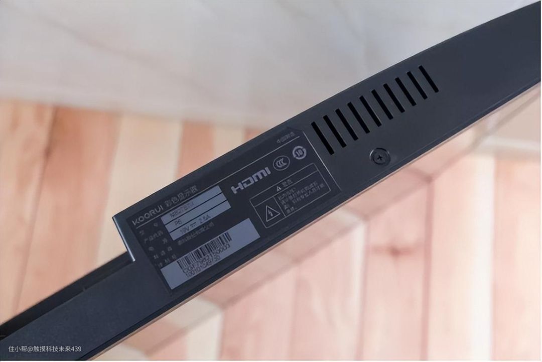 显示器的底部另一侧是显示器的铭牌标签,上面印有产品相关的规格参数信息。旁边也设计有散热孔。