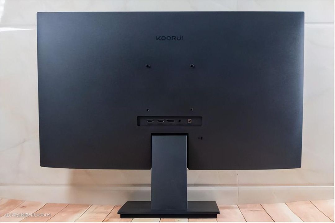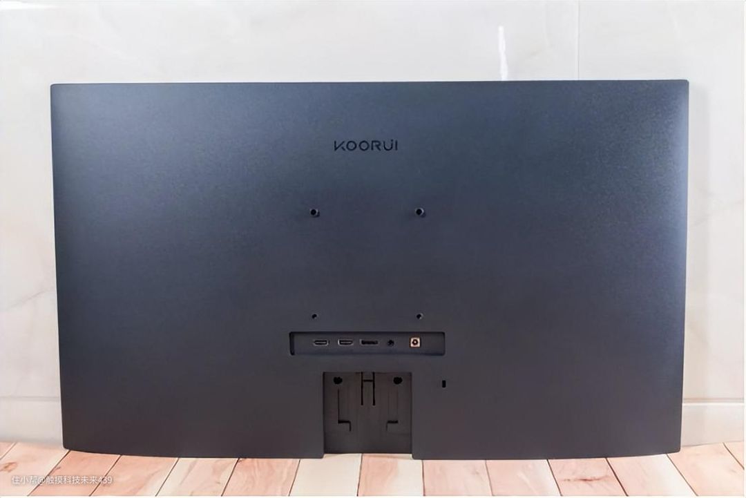 科睿P6 4K显示器的背面上方设计有科睿的品牌Logo。中间则是VESA壁挂孔,规格是100*100mm,下方则是接口的集中地,从左到右分别是HDMI2.0,HDMI2.0,DP1.4,Audio,DC电源插孔,再往下就是显示器支架的导轨卡槽了。