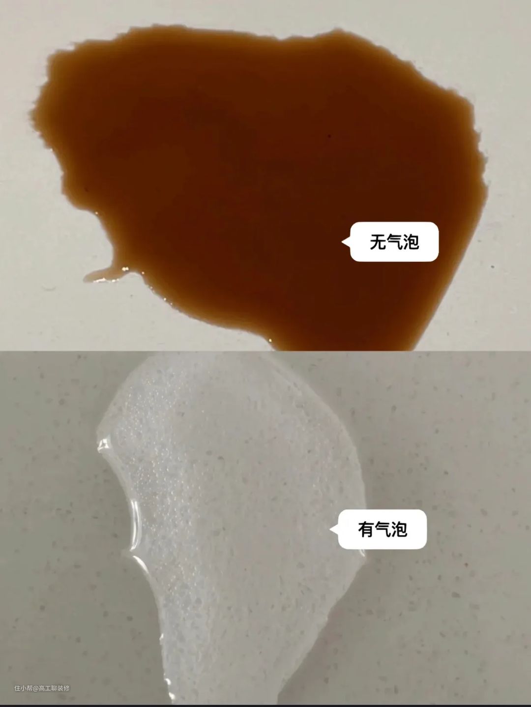 好的石英石台面一般会加入100%优质的全铝铝粉,把白醋倒在人造石及石英石的台面上,30秒后会产生许多微小气泡是假石英石,因为假石英石中的碳酸钙会与白醋发生化学反应,这样的台面价格低,很容易老化,开裂、吸色同时使用寿命短。