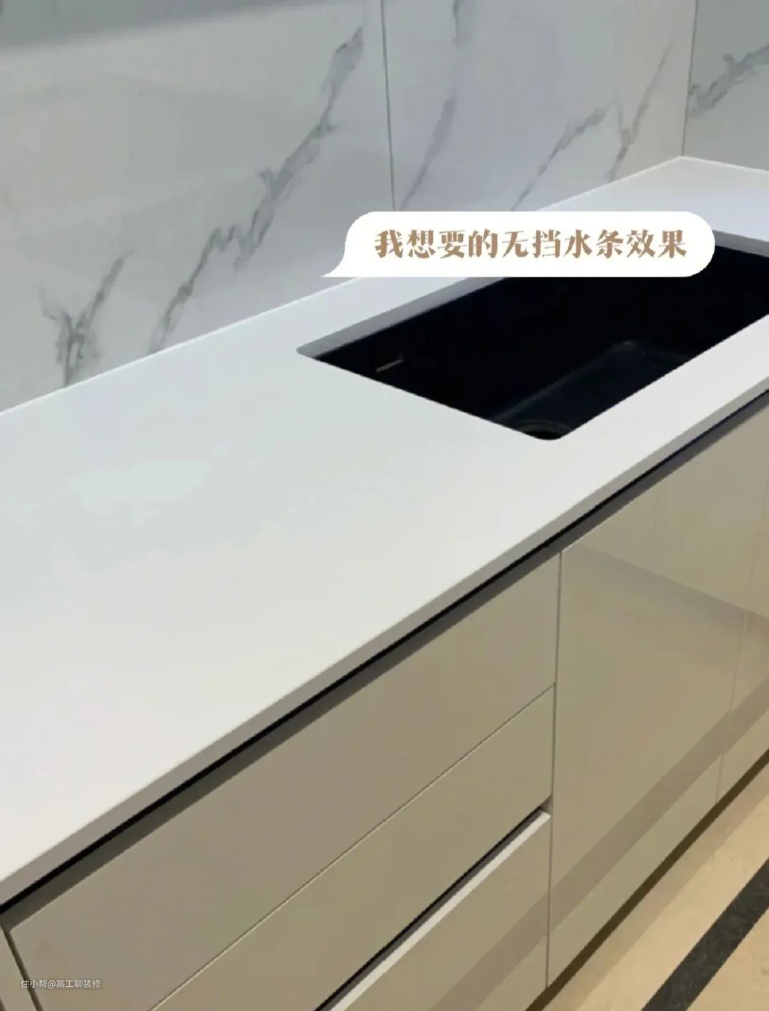 做了挡水条后,挡水条两侧非常容易脏,如果台面与墙面交接处无缝衔接,不仅解决了脏的问题而且不加挡水条的设计更好看。