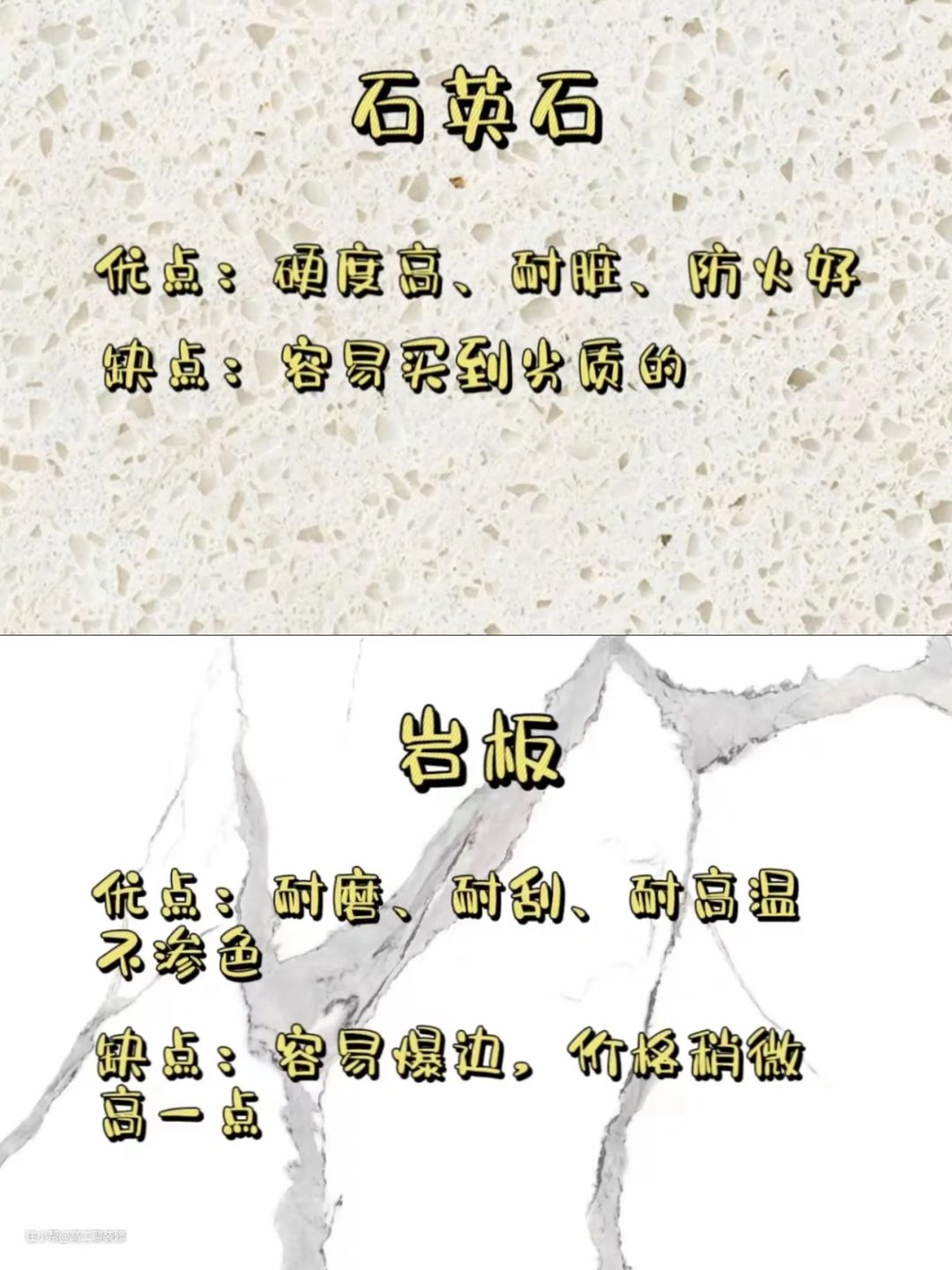 以上分析的四种不同材料都可以作为橱柜的台面,但是从实用性上还是石英石和岩板比较普遍,主要是石英石的硬度还有岩板的颜值都很高,那么这两种材料除了价格不同之外,还存在哪方面的区别呢?下面高工给大家详细分析一下。