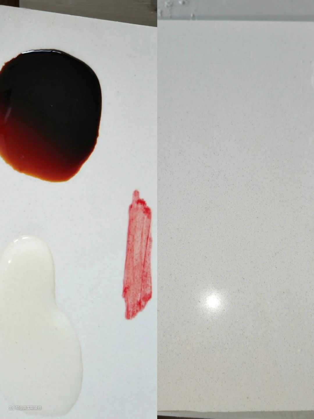 因为岩板是高温压制的,内部几乎没有空隙,所以任何东西几乎是没有办法渗透的,而石英石就不一样了,再好的石英石酱油倒上24小时后都会渗色,所以勤快人使用了石英石台面一直看起来很新,而懒人的厨房石英石台面往往有擦不掉的色渍。