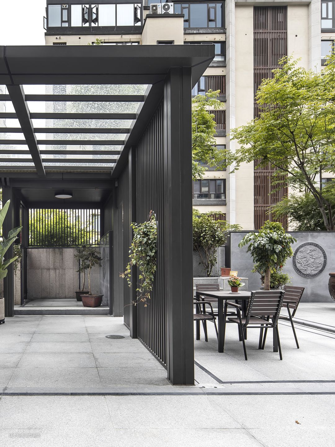 深灰色直线条的廊亭钢构造型