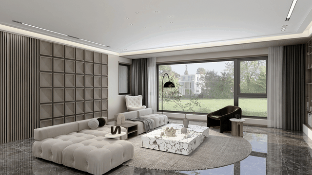 客厅中,原木色与高级灰作为空间中的主色调,不同明度的灰色丰富了空间的层次,大面的落地窗为空间带来充足的光线。白色纱窗一旁的柱子底部做了一个壁炉,为空间增添暖意,营造舒适惬意的氛围。