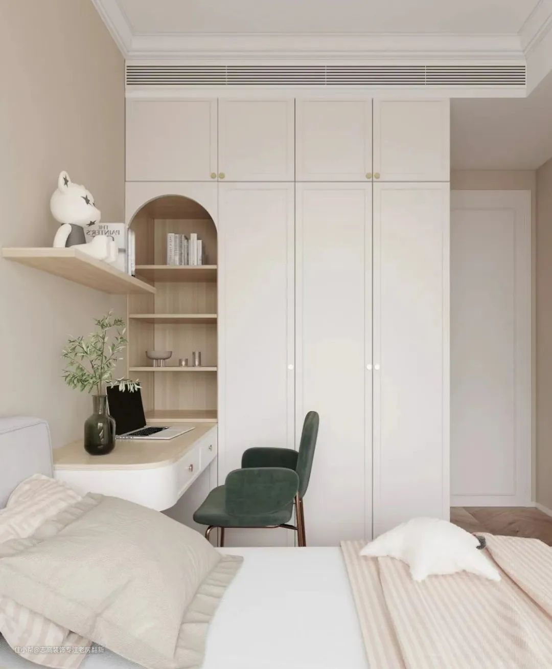 柜子可以通过假墙、凹进去的空间去弱化柜子的厚度,也可以通过柜面和墙面的颜色一致来弱化柜子的存在。一门到顶的本质也是通过减少横线在视觉上的存在,从而来降低柜子的存在感。