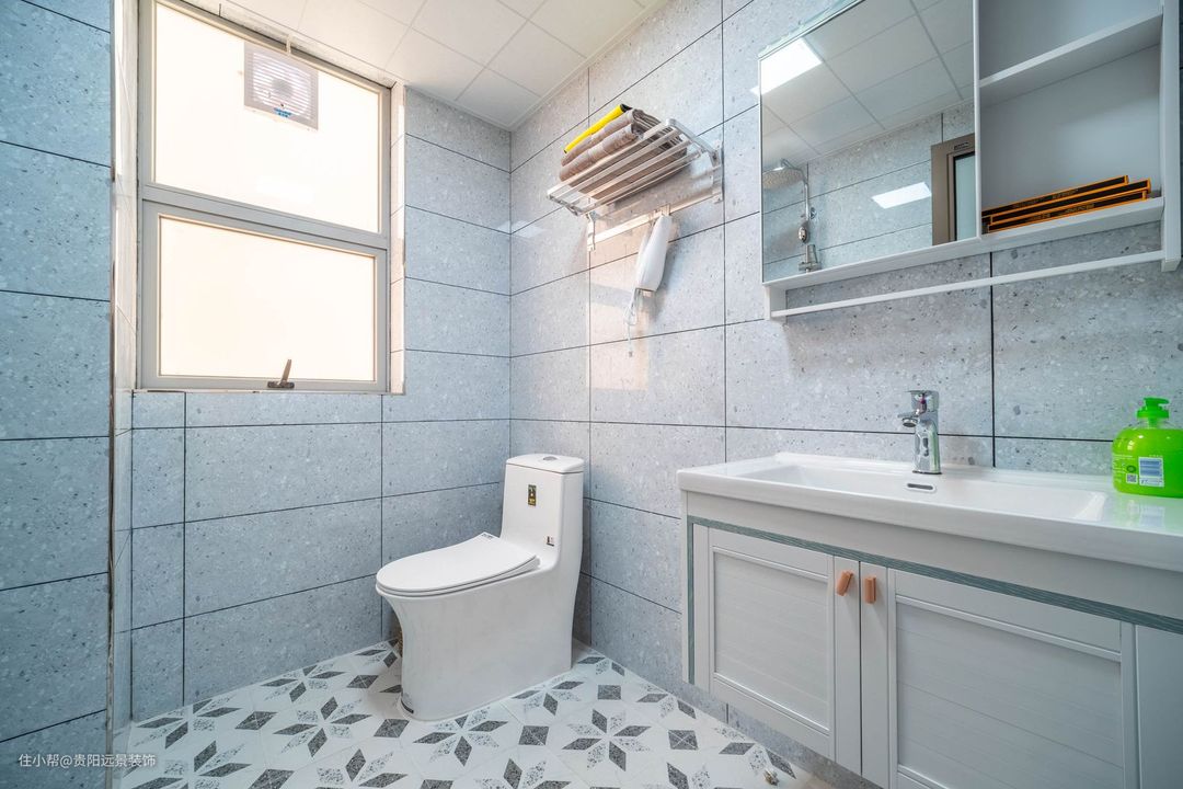 卫生间墙体是大理石花样的瓷砖,地砖是带有花纹的,空间层次看起来更加的丰富,时尚的元素增添了亮点,明亮的色彩显得空间更加的大。