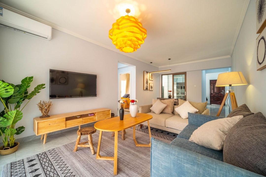 客厅是明亮的、通透的。原木色的茶几和电视墙增添了自然地氛围感,非常吸人眼球的主灯,把整个氛围感都提升到了一个不一样的氛围,温馨自然,和谐共处。