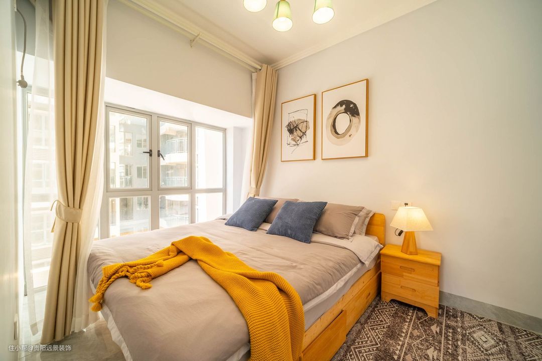 次卧的房间是温馨的氛围感,沉静、温和的气质,颜色都是平和的,能够安抚人心,小巧的台灯在空间的装点上起到了不可或缺的作用。