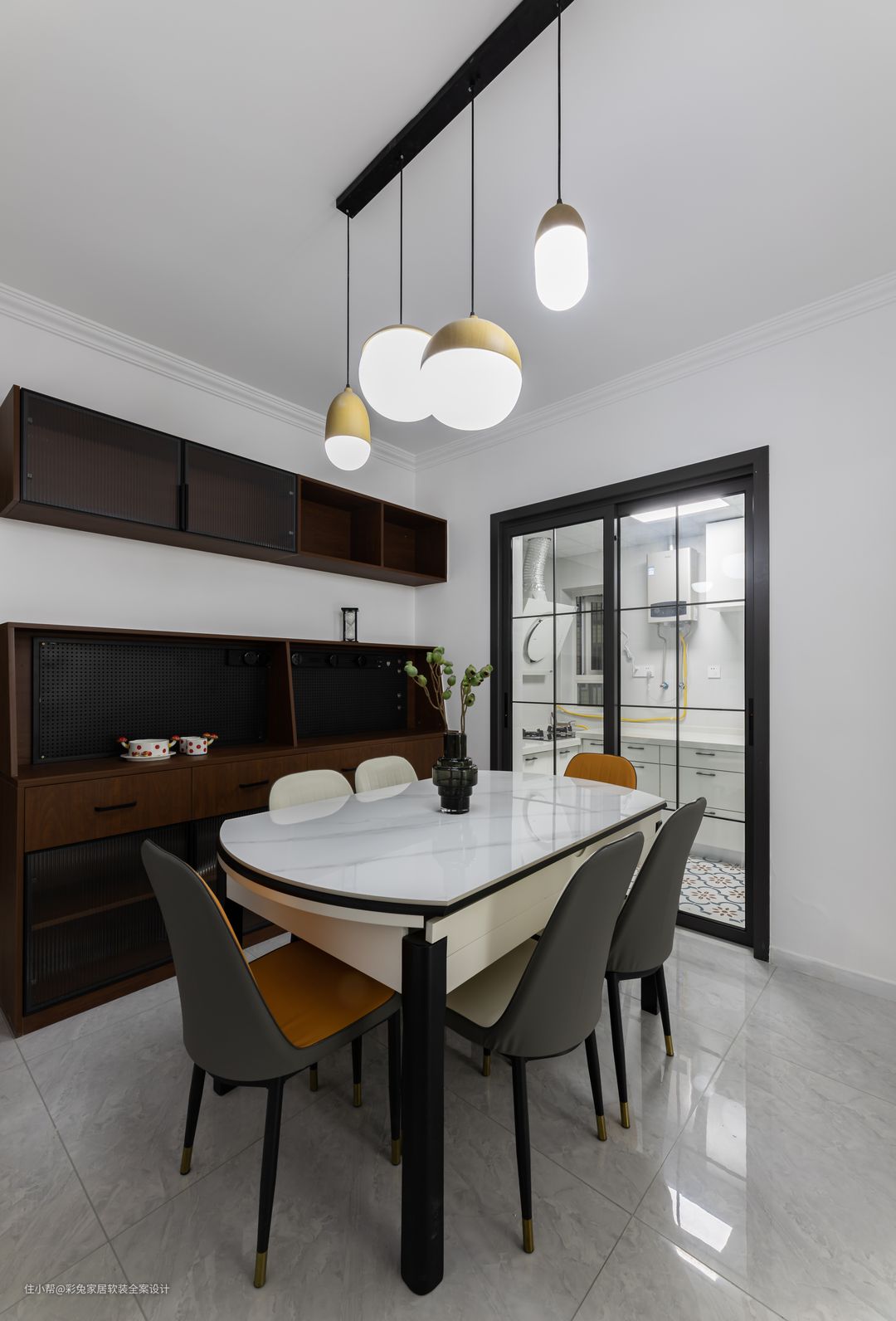 定制餐边柜选择深色实木纹面板,与厨房的黑色细边框门搭配,让墙面的风景更加有质感。黑色线条在餐厅吊灯、餐桌边框等家具软装上都有体现,进一步勾勒出一个鲜明美观的就餐空间。