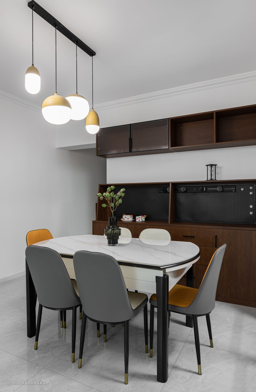 白色顶面,用了一组几何造型的吊灯,一下子就把空间的趣味性给提升起来。犹如一串跳跃的音符,奏响用餐时间的欢悦心情。