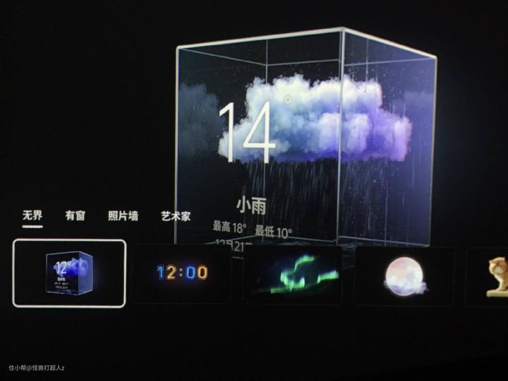 无界的素材都是动态的,有天气盒子、工业时钟、极光时钟、昼夜时钟、猫爬架、宇宙六个素材。在这里我不得不提一下极米神灯它投影的无边界显示了,当我看到上蹿下跳的猫猫和缓缓流动的宇宙,悬浮在墙面上,就好像真的一样。