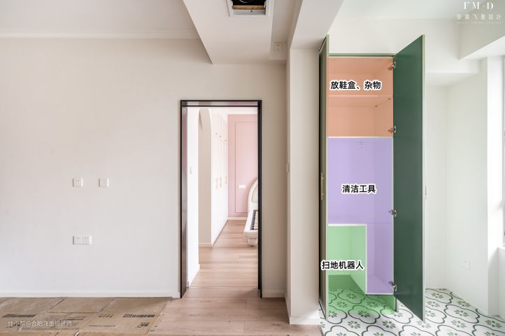柜门拉开,分为上下4层,最底层用来容纳扫地机器人,进出自如。第三层可供吸尘器等清洁工具存放之用。最上面两层放放鞋盒、杂物,也是实用性满分。