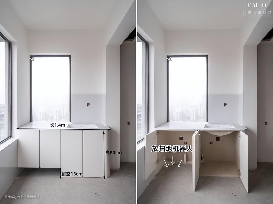 【锦绣首玺】这家就是典型例子,长1.4m,高80cm,右侧是洗衣池,站在这清洗衣物不费腰。左侧就是无底柜设计了,柜门没有装到底,留空15cm,加上内部留的插座,后期放扫地机器人在这进出自如,同时也能实现隐藏。