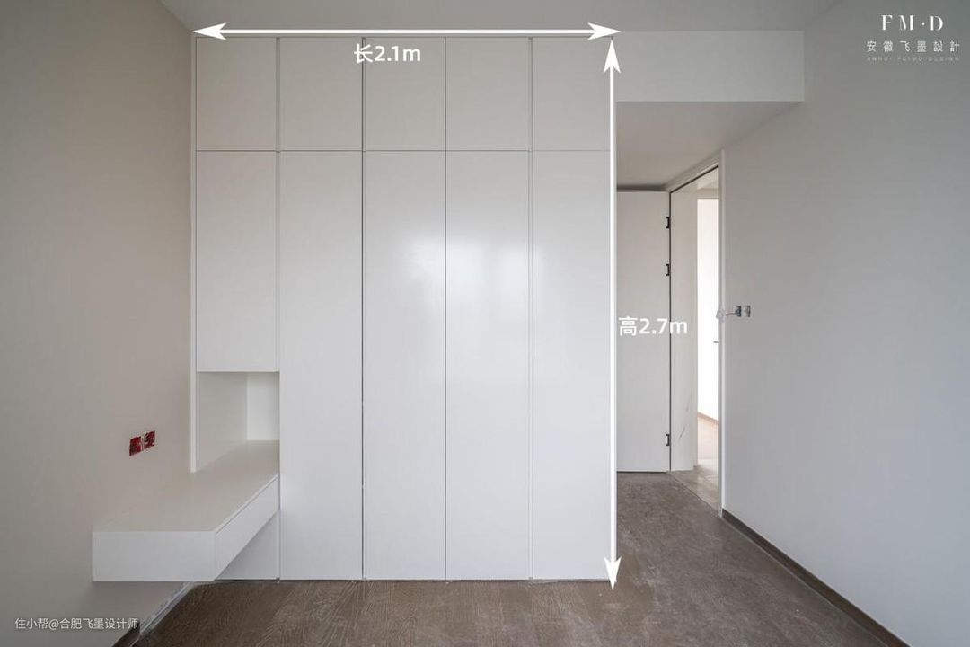 这组衣柜位于书房,长1.2m,高2.7m,白色混油柜门+铣槽拉手,外观就足够简洁大方。内部布局只挂不叠,符合业主的使用习惯。侧边留了3组抽屉柜,长51cm,高68cm,方便存放一些小件衣物。