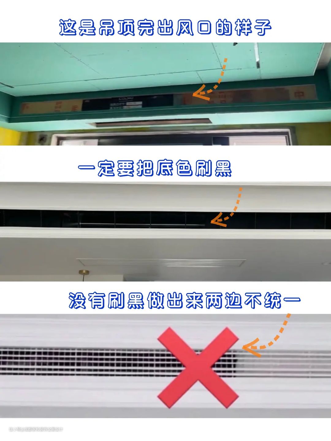 4.吊顶上漆阶段一定要用黑色乳胶漆涂刷整个风口,让整个风口颜色统一,不然会出现半黑半白的样子不协调。