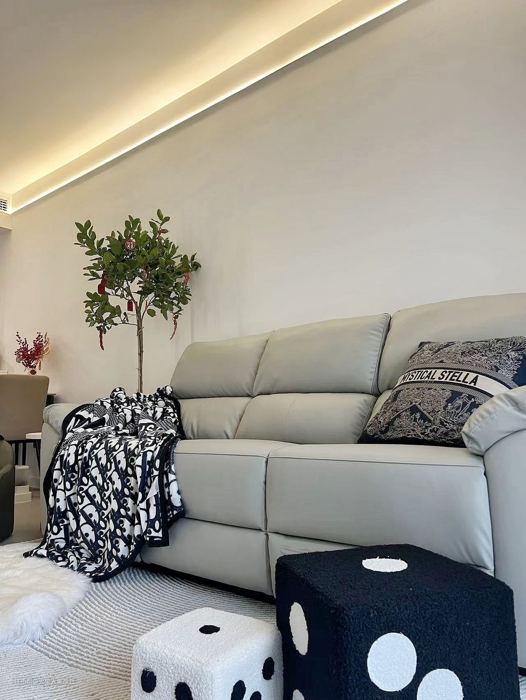 可以像屋主一样,在客厅里摆放一些绿植,红色和绿色的装饰在整体的灰白空间中,显得极为生机勃勃,富有生活气息。
