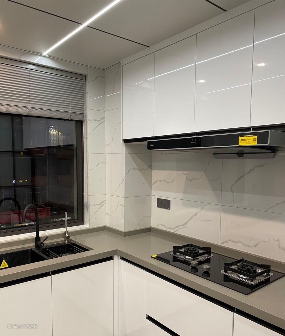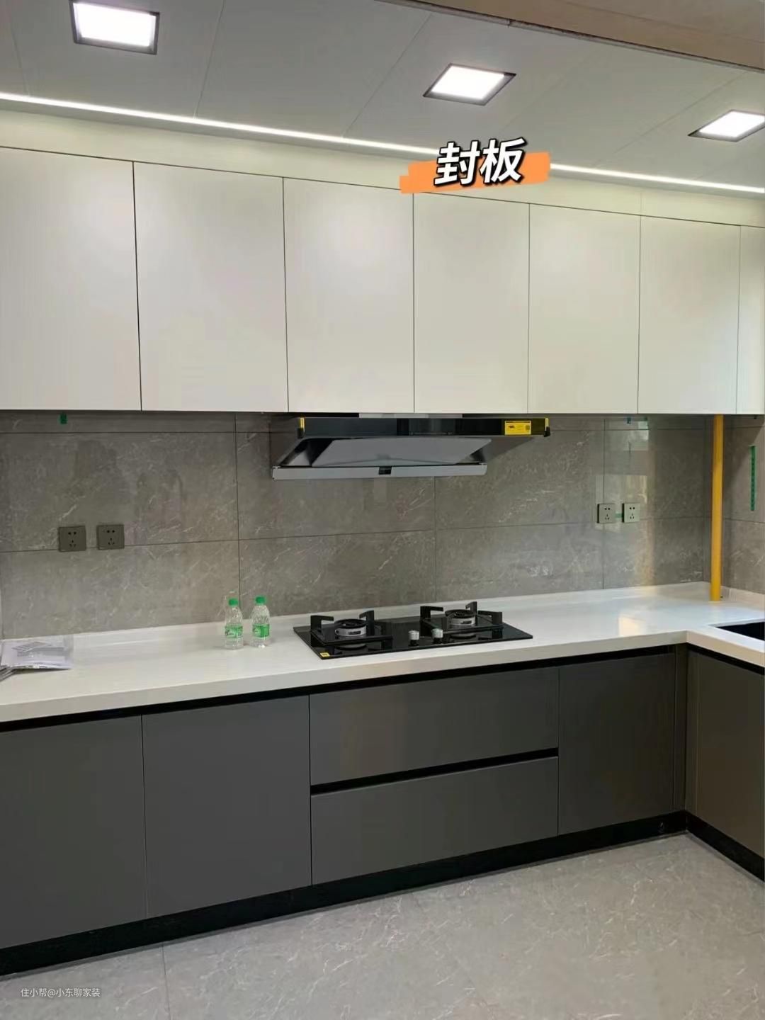 小东建议:所以,建议橱柜务必做到顶,颜值高效果好看,同时也省去了打扫卫生的麻烦。预算高,建议直接做柜门加长。想省钱,加一条顶封板即可。
