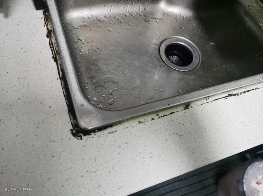 就是这个台面与挡水条之间的缝隙,就是妥妥的卫生死角,藏污纳垢不好清洁。而且,打胶的地方受潮后,势必还会发霉变黑,滋生细菌。
