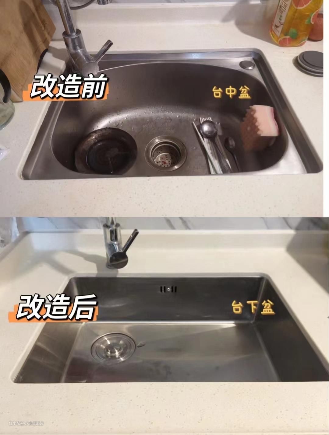 小东建议:随着技术的升级和改良,现在水槽安装还可以选择台中或台下盆。台中盆是与台面齐平,美观且好清洁。但这种做法,对安装手艺要求高,做不好会有边缘不齐,缝隙大的问题。