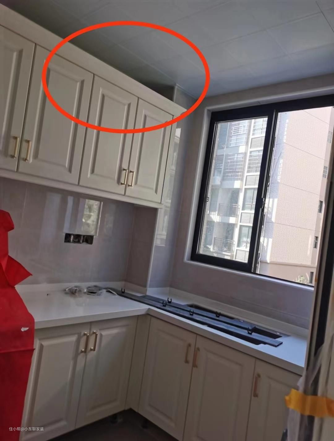 我家第一套房子装修时,就踩坑了。我以为所有橱柜都是默认到顶的,所以设计图也没有注意看,结果安装完柜子与吊顶之间还有很大缝隙,入住后是越看越不顺眼。