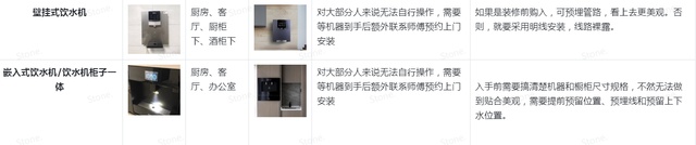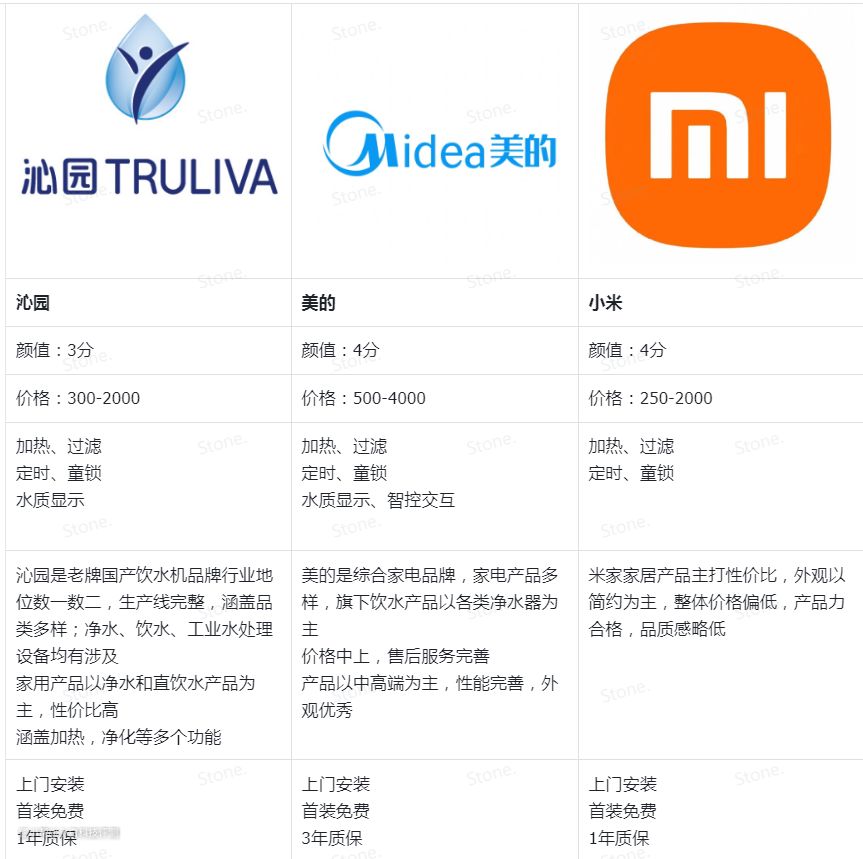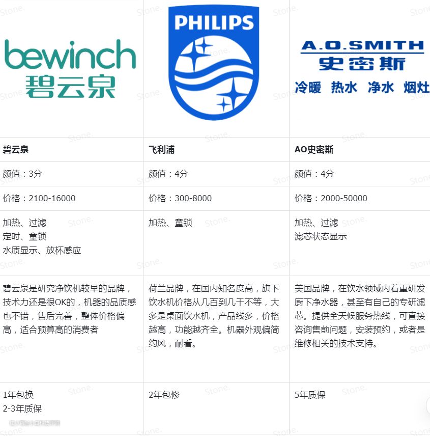 也有专门做饮水产品的像沁园、碧云泉、AO史密斯等。表格从价格、功能、颜值、服务列举了几个品牌的特色。