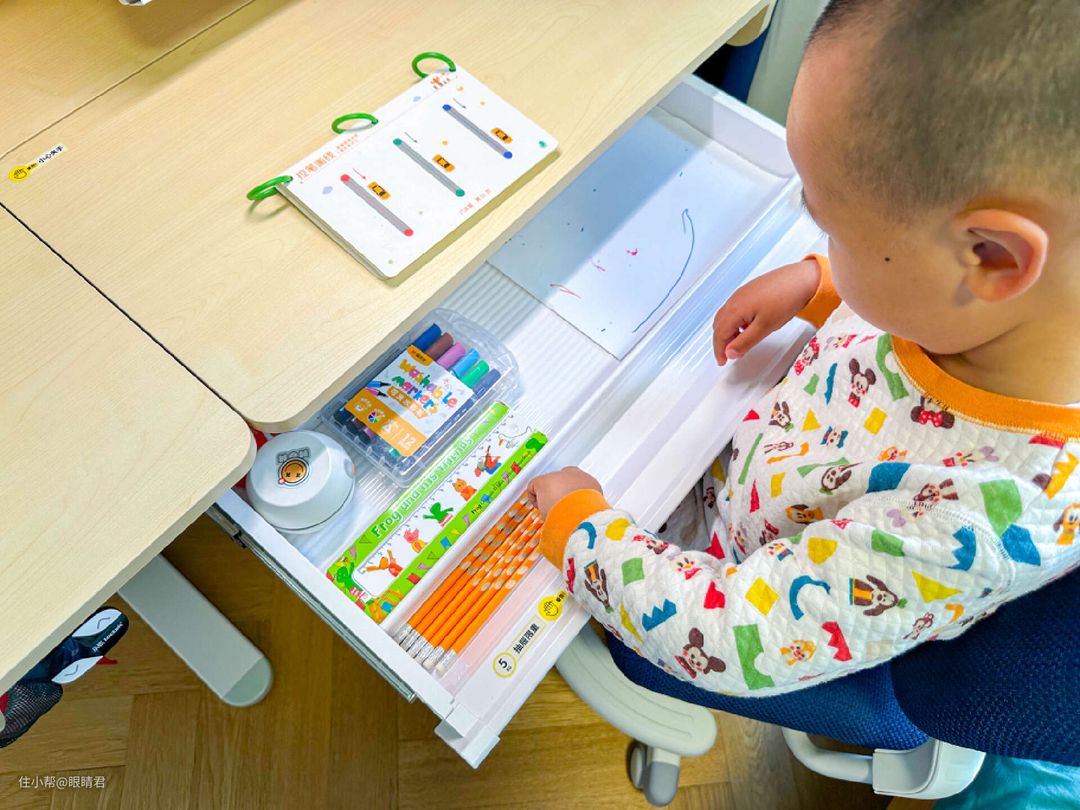 桌面下的分区大抽屉,可以分类收纳各类文具,孩子的铅笔、水彩笔、橡皮,都能按格收纳,对于我家这位从小喜欢把各类玩具摆得整整齐齐的处女座男宝来说,太合适了。