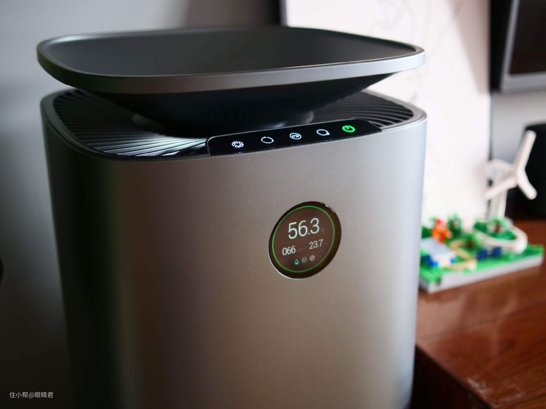 操控区和显示区位于机身正面上方,5个触控按钮搭配一个圆形的LED屏幕,不管是操控还是查看当前工作状态都很便捷。LED屏幕日常开启下可以显示当前室内PM2.5值和湿度、工作模式等信息。