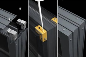 ▶撞角注胶:系统窗户采用铝材与隔热条拼接手法。为保证窗户密封及牢固性,系统窗采用撞角销钉角码注胶工艺,而普通断桥铝撞角仅仅采用合金角码固定(左一图),无注胶工艺(中间图)▼