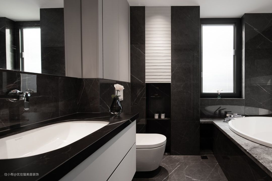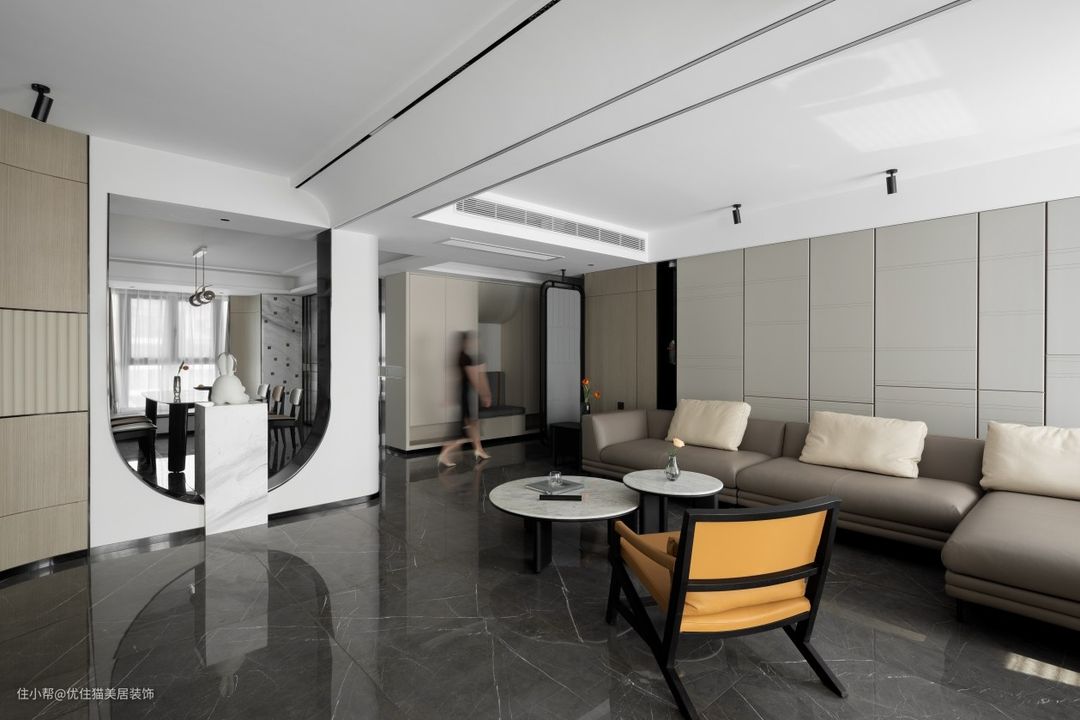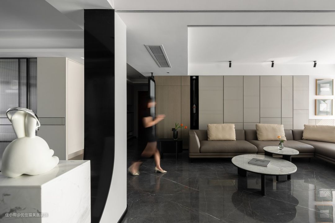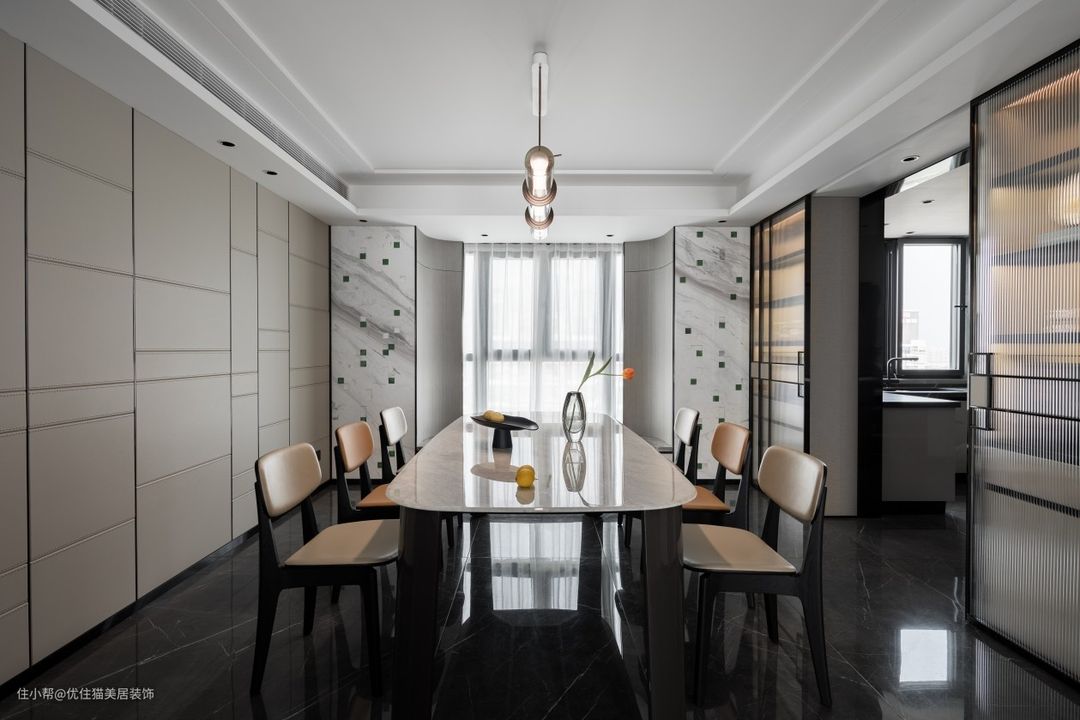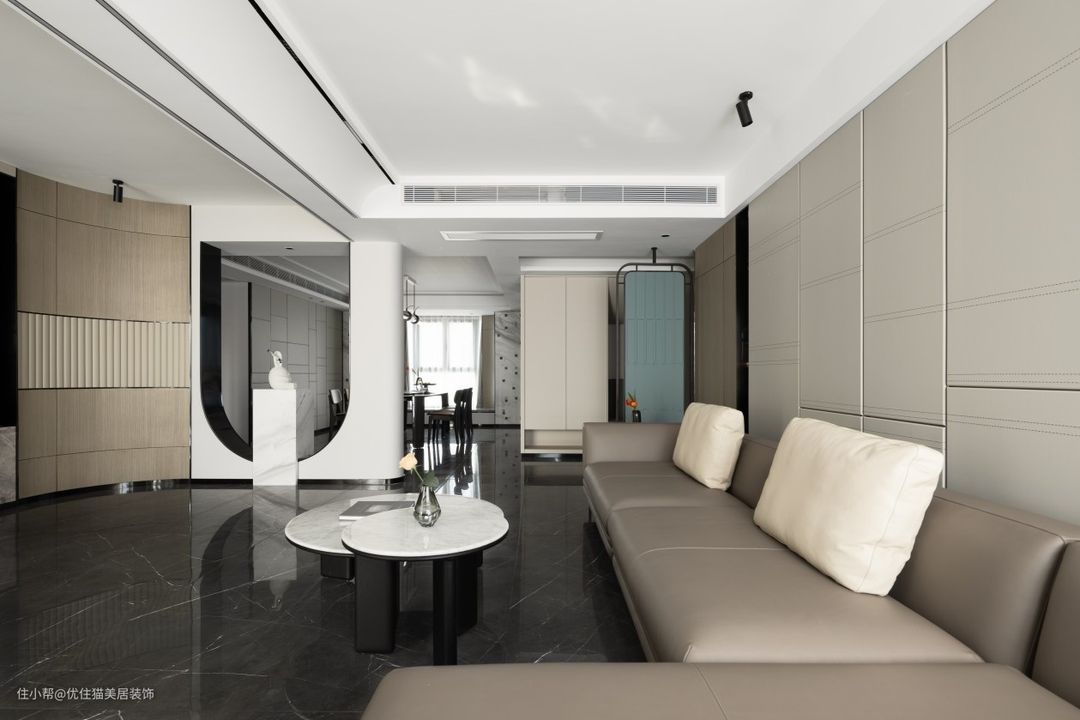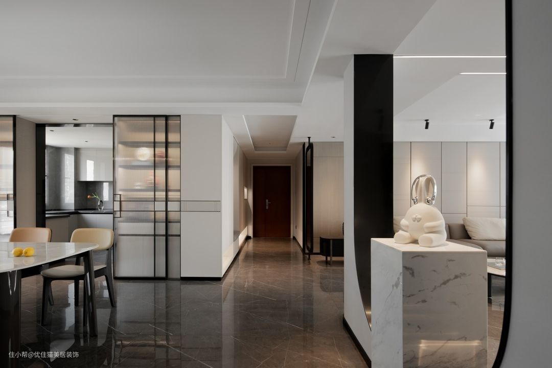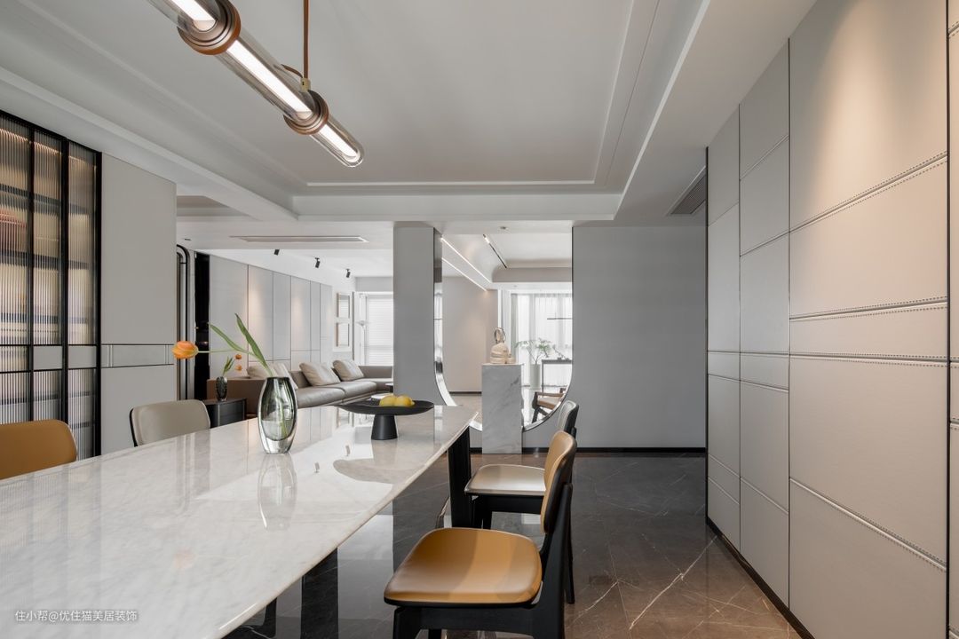 开放式布局:巧于变幻 精在体宜 皮革硬包,延续客厅氛围,白色石材点缀雨花石,场所精神在细节处体现