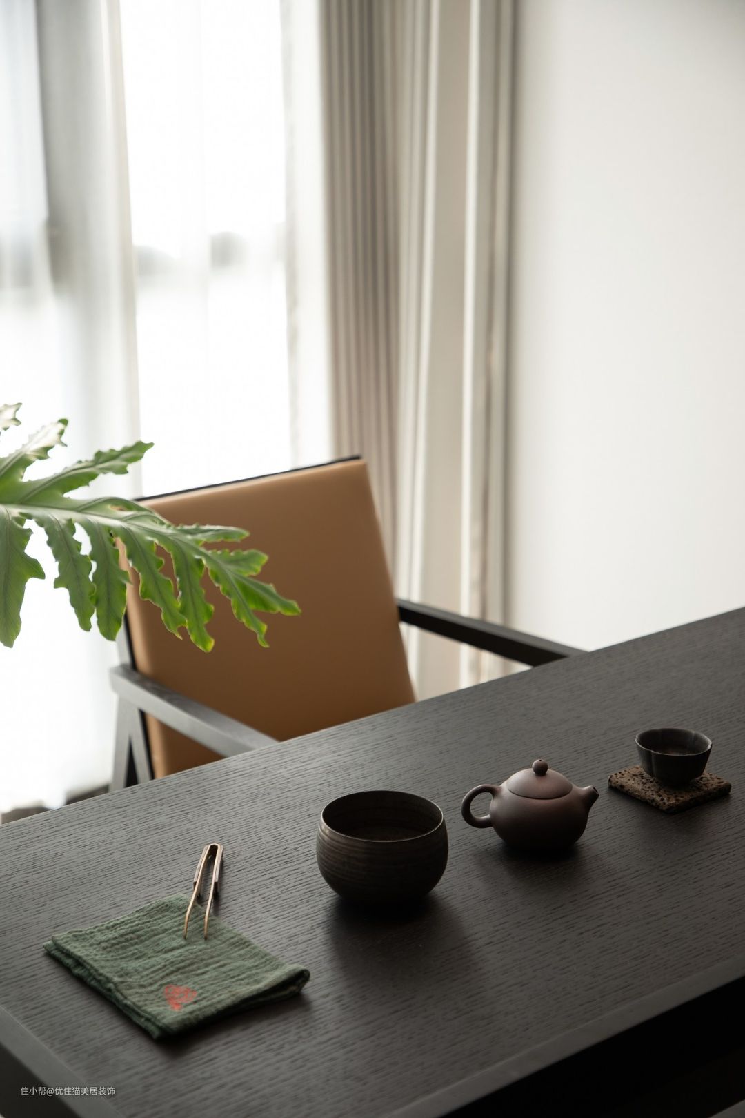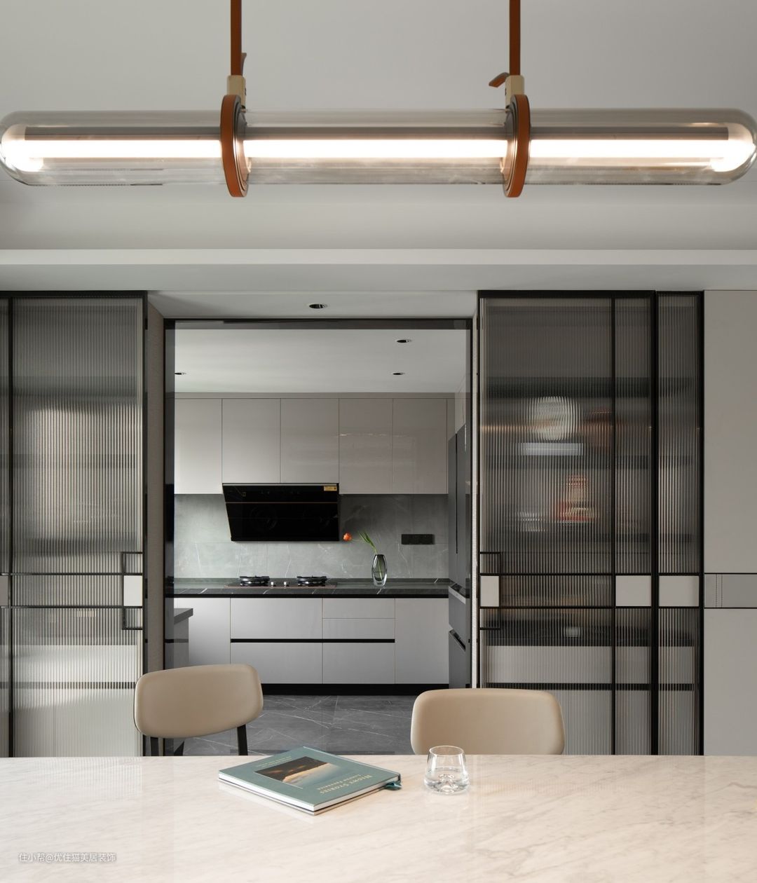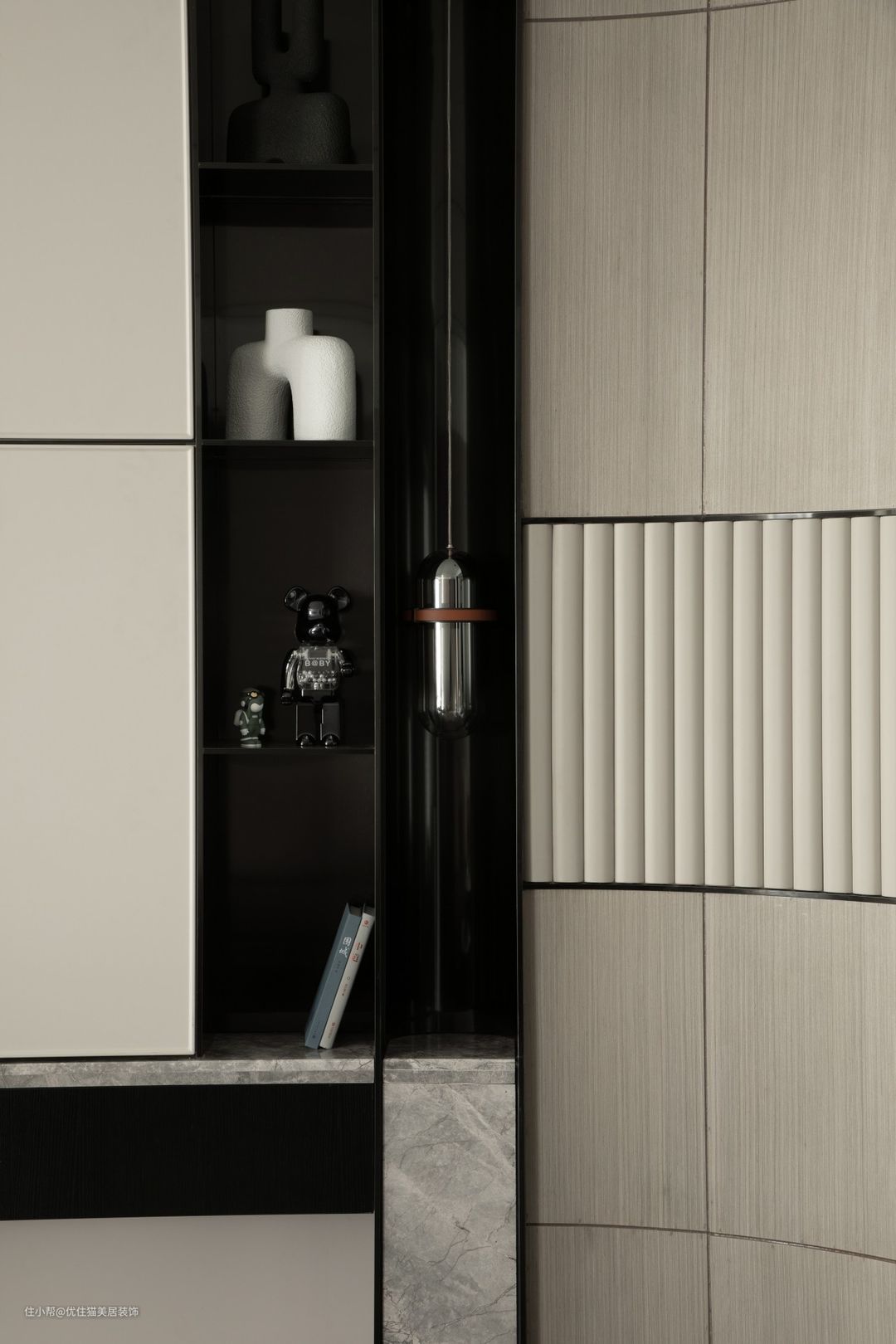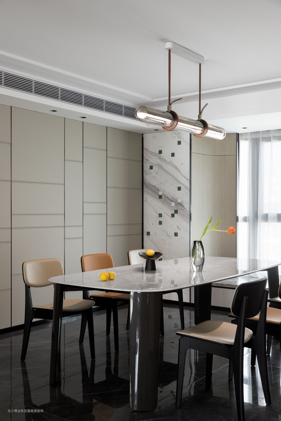 开放式布局:巧于变幻 精在体宜 皮革硬包,延续客厅氛围,白色石材点缀雨花石,场所精神在细节处体现