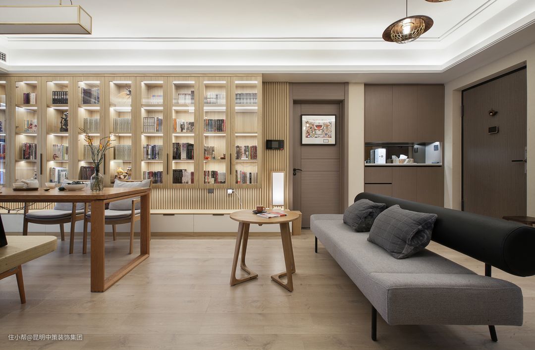 设计师根据业主需求,客餐厅设计取消了传统的沙发和餐桌,超大的书桌满足业主在这里办公、阅读、吃饭、喝咖啡等所有需求,客厅满满的书柜既能收纳又是展柜。
