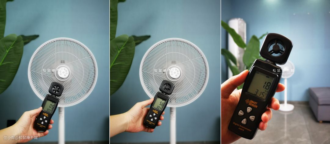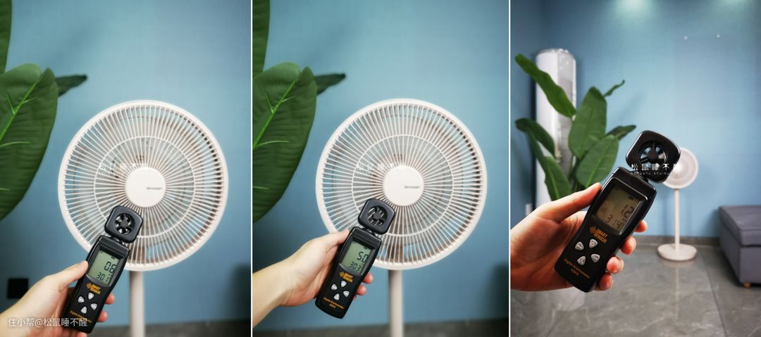 最小都有2.4m/s的风速,我觉得已经可以和其他几款的中档差不多了,小风档感觉有些偏硬、不太柔和,最大有4.8m/s的风速,退到3米的位置时,风速下降至0.8m/s,风感明显变小。