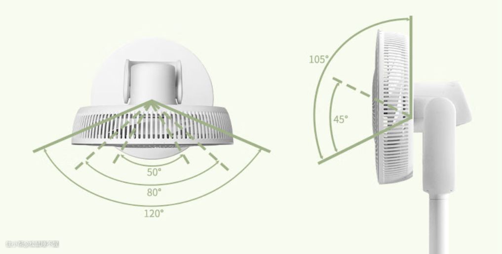 阿卡驰这款可以做到自动上下90° ,自动左右120°,中途完全不需要手动干预,而且在角度大小上还可以自定设置,设计了7种循环⻆度摆幅,左右摆动包括30°,60°,90°,120°,上下摆动包括30°,60°,90°,操作上十分人性化,放在任何角落都可以找到最合适的摆幅。